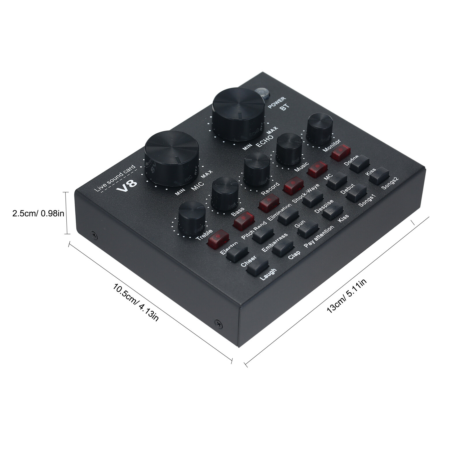 Independent control knob with adjustable microphone volume, reverb volume, treble, bass, recording volume, music volume, monitor volume.