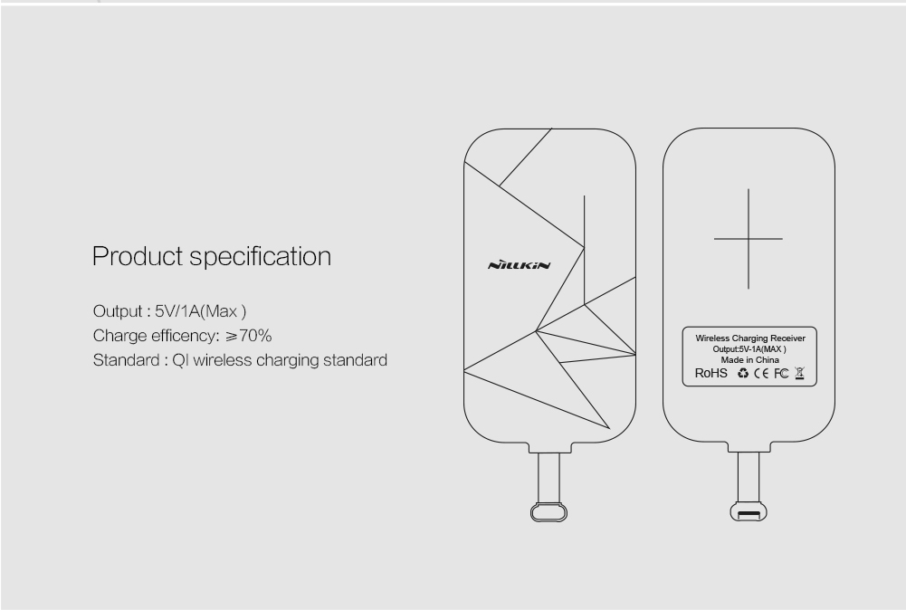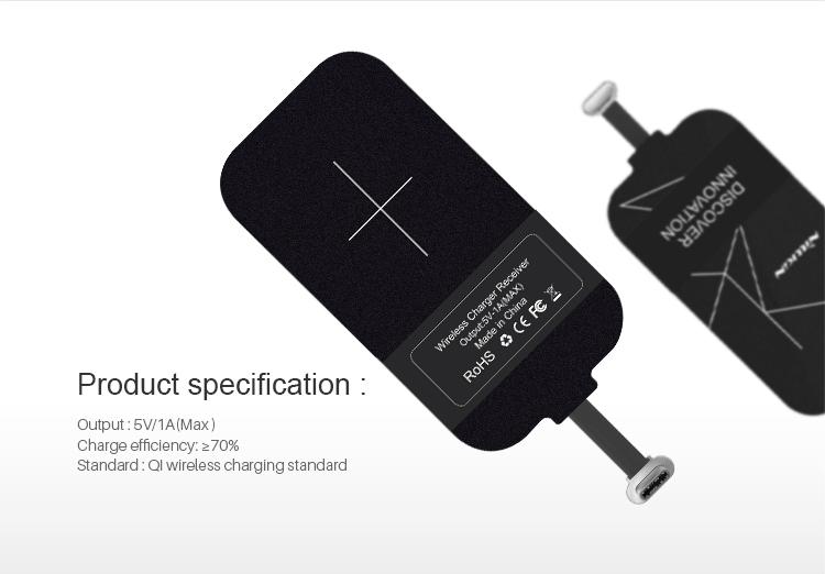 Wireless Charging ReceiverNillin wireless charging receiver makes quick wireless charging with cable freeOutput: 5V/1A(Max)Charge Efficiency: Around 70%Standard: Qi Wireless Charging StandardSlim Design - A new way of wireless charging, full use of the inner space of phone, very tiny & portable,Stable and durable - The metal type-C interface made by meticulous workmanship is reversible. Compartible with all kinds of phone with Type-C interface. The metal eletroplating shell is stable.Plastic Tiny Tag - Precise technique process produces stable and durable magic tags with more excellent transmission performance.Precise technique process - Plastic tiny tag, with higher resistance to wear comparing with ordinary tag, is more waterproof and stain-resistant.Texas Instruments - Texas Instruments is a global leading analog and digital semiconductor IC design and manufacturing company.Absorbing materials - It refers to a kind of materials which can absorb the electromagnetic wave energy onto its surface. It requires the advantage of light quality, heat resistance, moisture resistance, corrosion resistance.Universal, compartible with most smartphones - Enjoy wireless charing immediately by plugging into charging port and connecting with receiver onto phone's back cover. It becomes universal that phone without metal contact or with undetachable back cover can be wireless charged efficiently.