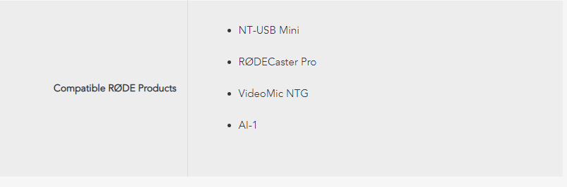 This cable is compatible with Rode devices utilizing a USB Type-C connection, including the NT-USB Mini, RODECaster Pro, VideoMic NTG, and AI-1.