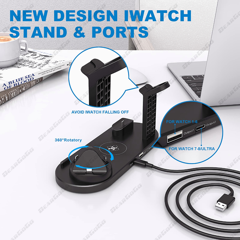 The Smart charging station combined qi fast wireless charger with 3 connectors base charger, iWatch ,Airpods charger and a USB outlet in one holder, support charging your apple watch, Airpods,iPhone/Samsung simultaneously. The 3 connectors base is rotary at 360°, Suitable for iPhone ,Android Type-c and Android Micro-usb cell phones