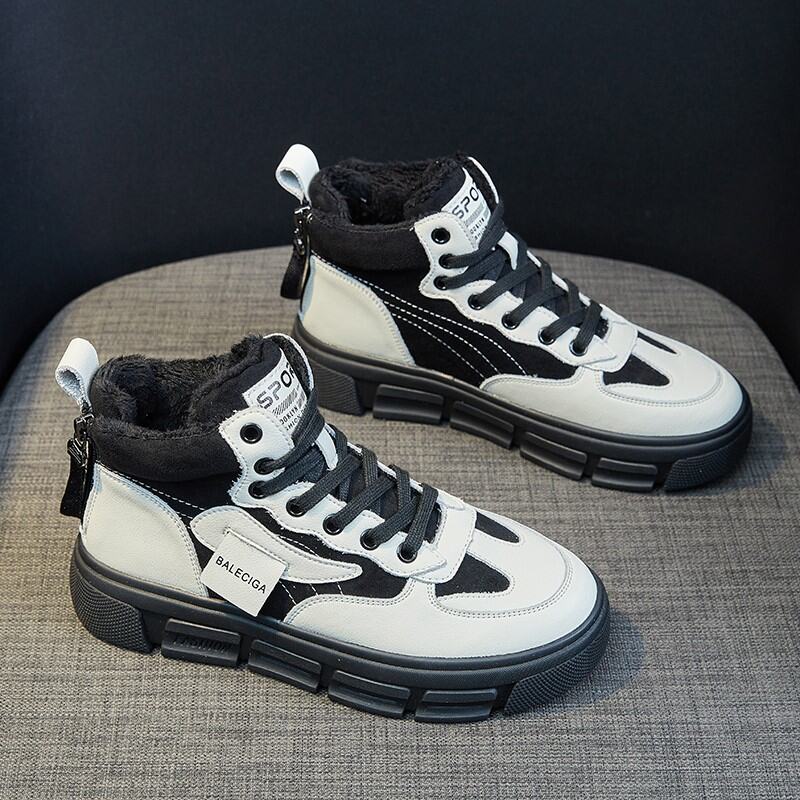 High-Top Cotton-padded Shoes Women's Winter Fleece-Lined 2021 New All-Match Genuine Leather Platform Sneakers Elevator Dad Shoes White Shoes