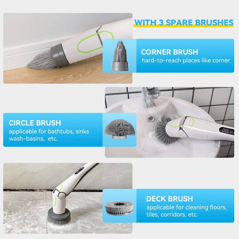 【 Replaceable Cleaning Brushes 】 With 6 Replaceable Brush Heads, You can clean for bathroom, different floors, car, walls, windows, glass surfaces, patio furniture, tile grout, shower, toilet, bath tub and kitchen, it also cleans car tires well. Greatly meets the need for cleaning in different scenarios. The highly sealed design also makes hurricane spin scrubber resistant to splashing water and can be used under wet situation.