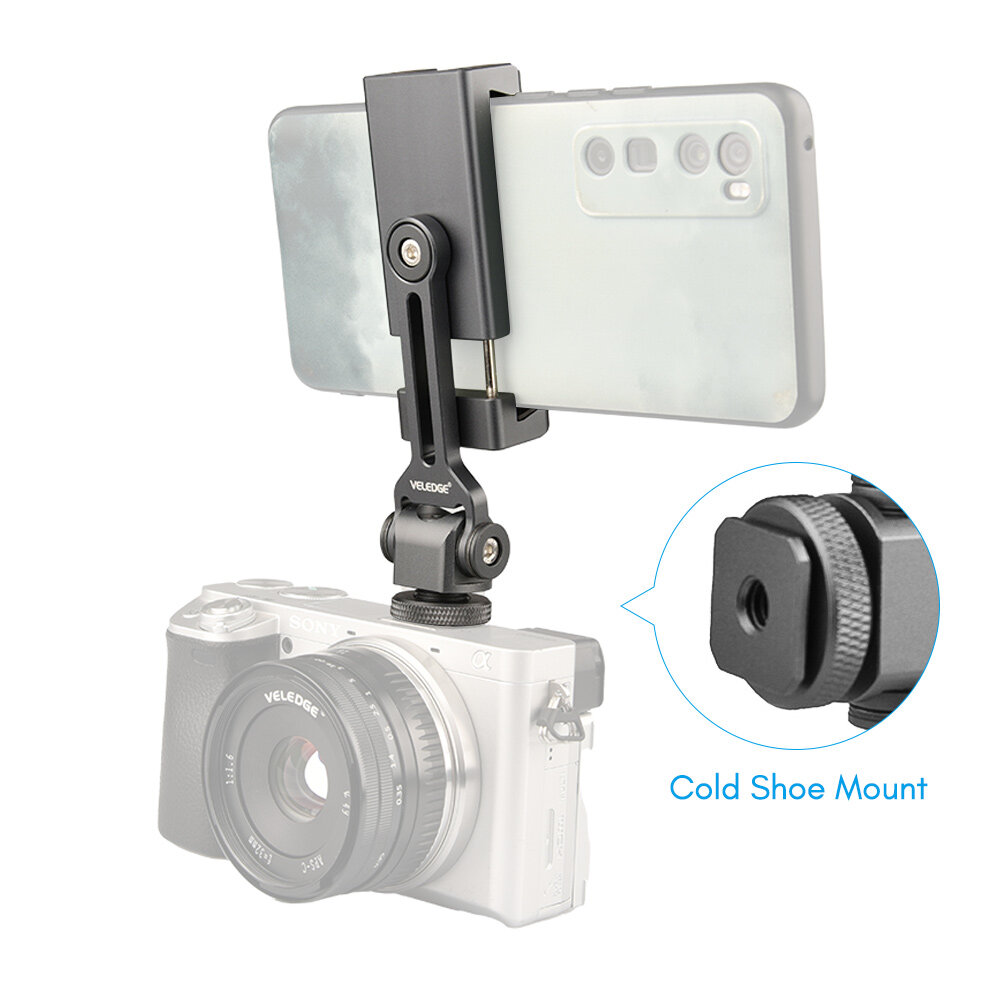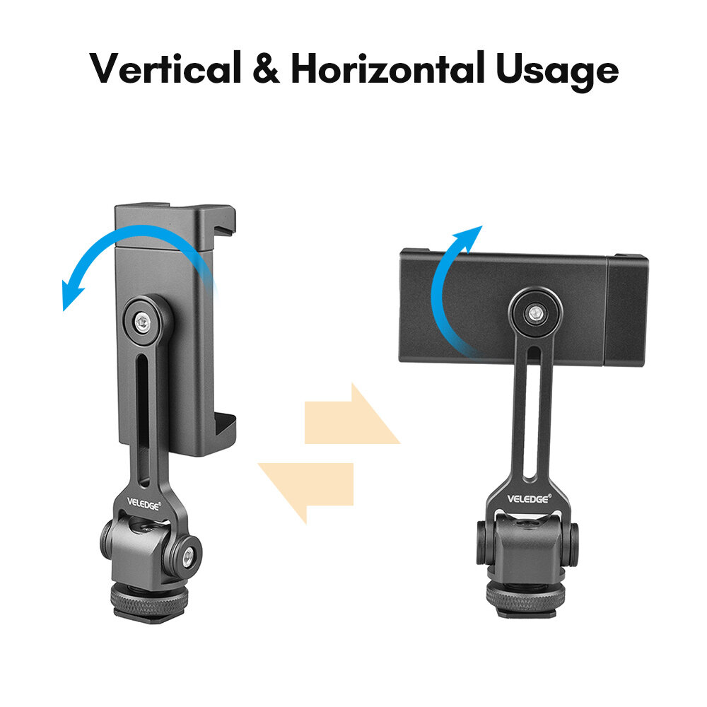 VELEDGE Aluminum Alloy Phone Holder Clamp Phone Tripod Mount 360° Rotatable with Dual Cold Shoe Mounts for Smartphone Vlog Selfie Live Streaming Video Recording