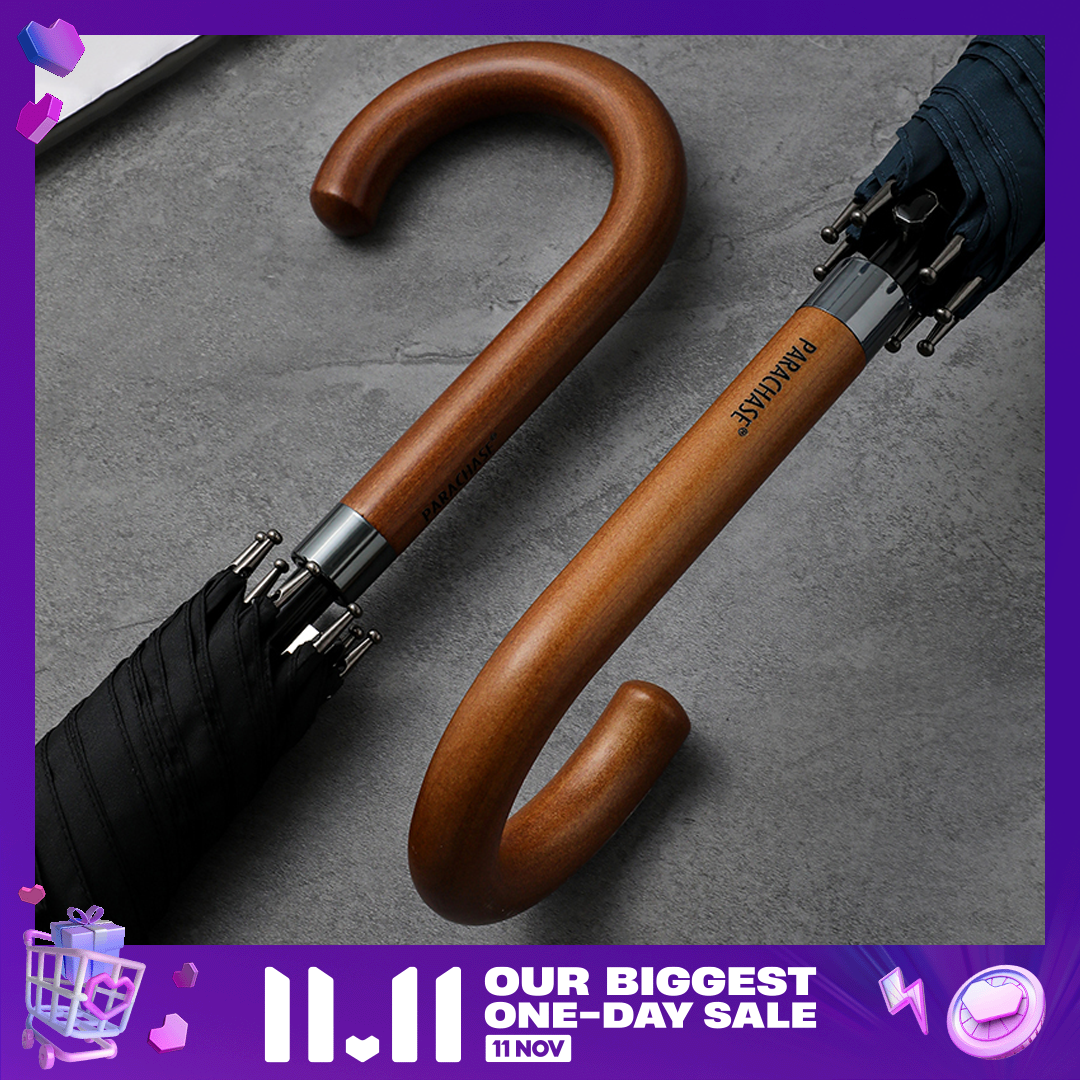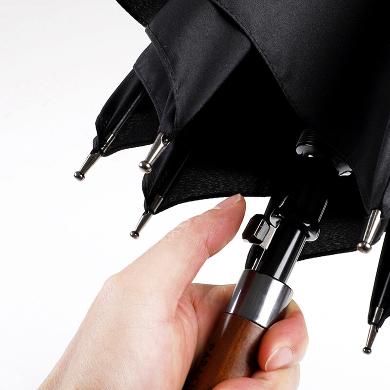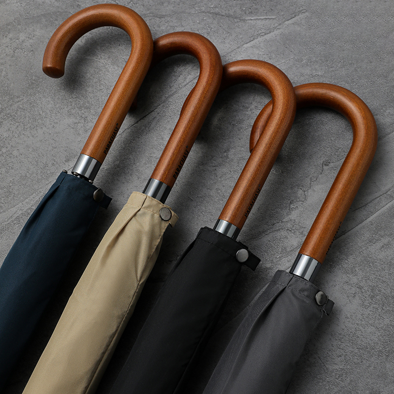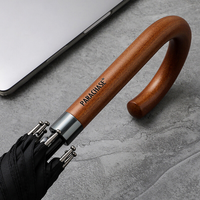 Parachase classic long handle umbrella, luxury and fashion, business style wood umbrella for men.Quality wooden handle with metal, semi-automatic to open, 3 colors available. Large size and super windproof, high density pongee cloth is quick-drying.
