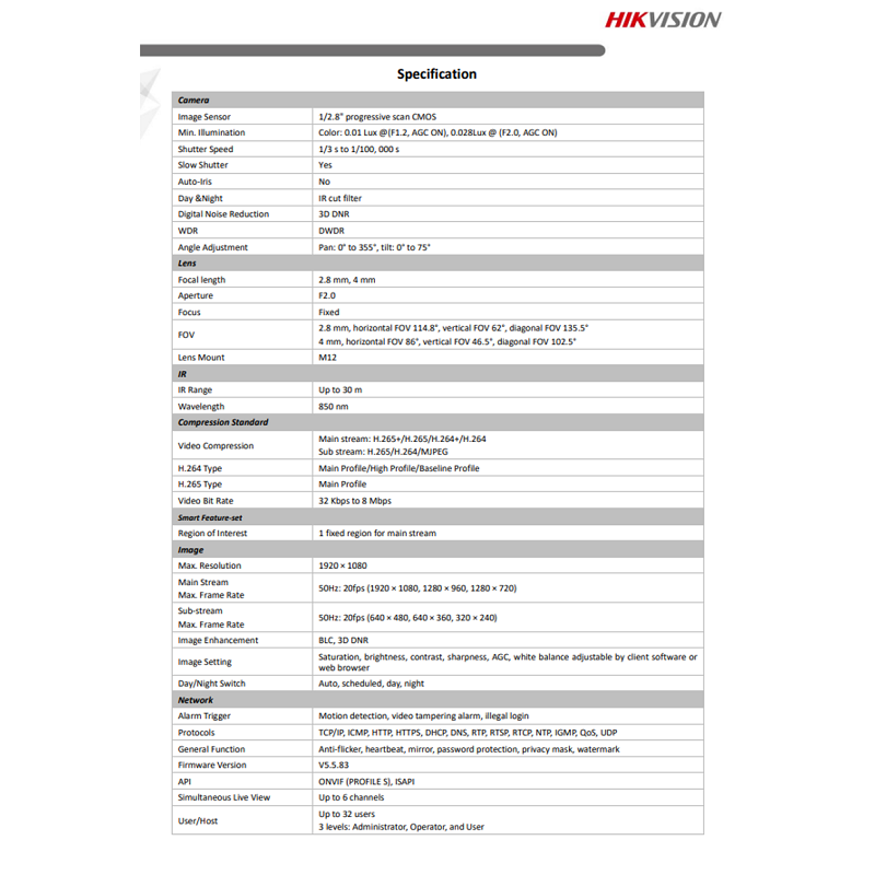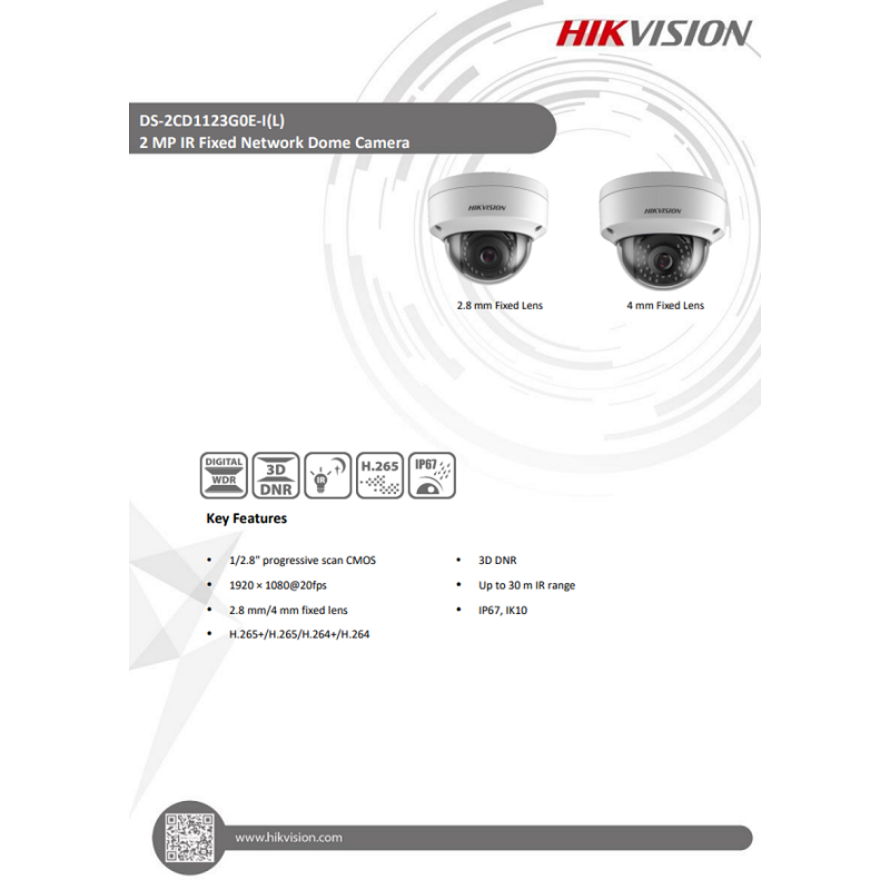 Hikvision 2MP IR Fixed Network Dome Camera (1920 × 1080 20fps, IP67, IK10, 30M IR Range, 2.8mm Fixed Lens)