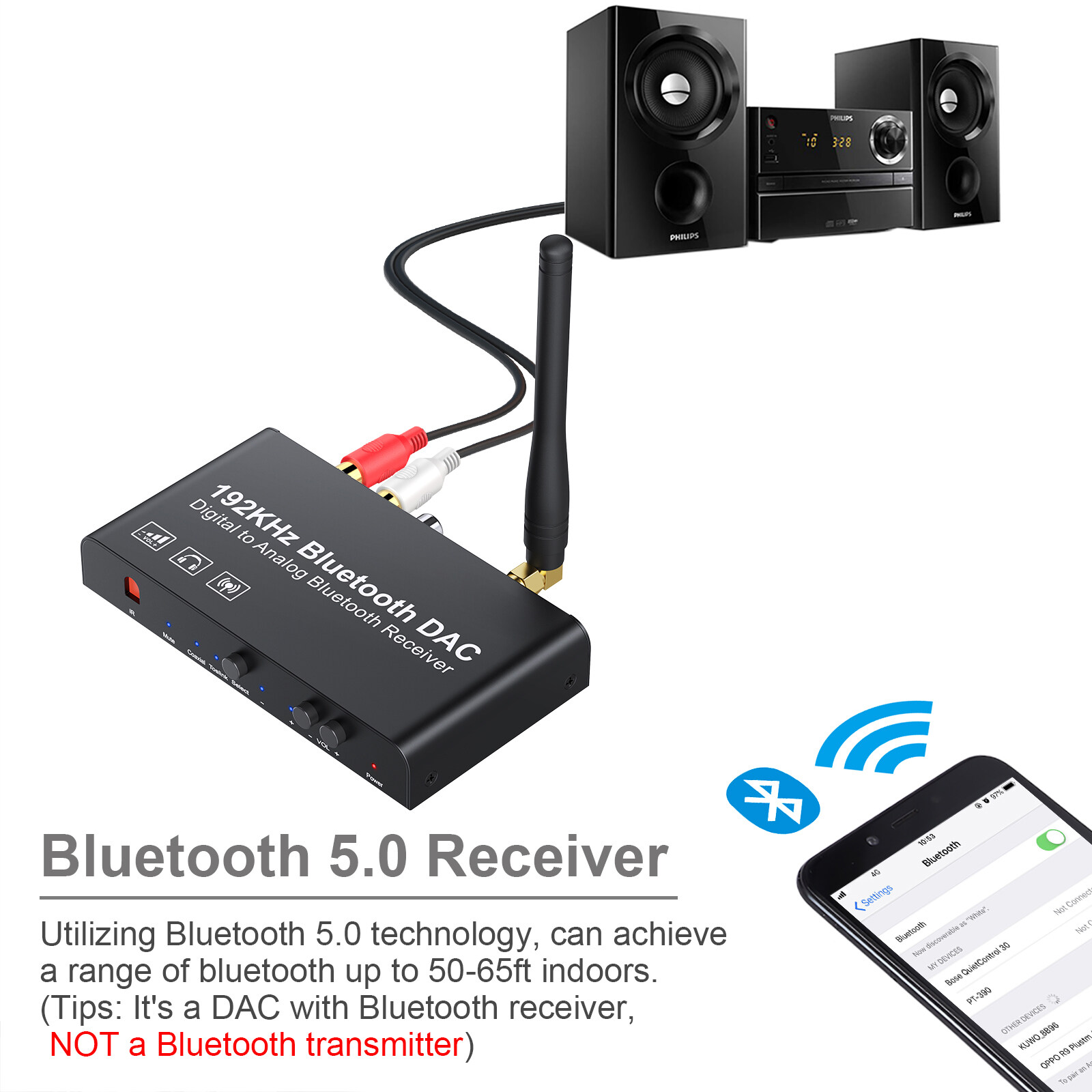 Digital to Analog Audio Converter is converts Coaxial or Toslink digital audio signals to analog L/R audio and available for connection to an external device. Built-in Bluetooth receiver module, supports mobile phone Bluetooth audio push, Bluetooth 5.0 lossless transmission technology.