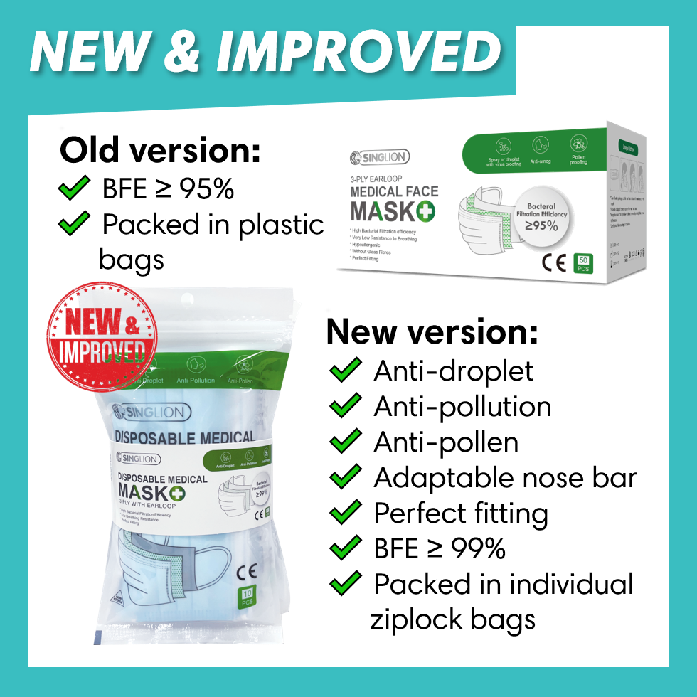 [Local Restock] Singlion 3 ply Disposable Surgical/Medical Face Mask Singlion Medical Mask (3-Ply With Earloop) - Disposable, Adaptable Nose Bar, High Filtration